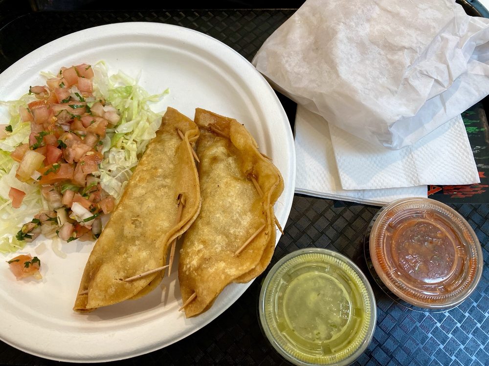 3 chicken fried tacos, sour cream, cheese, lettuce, tomato sauce, side of rice and beans