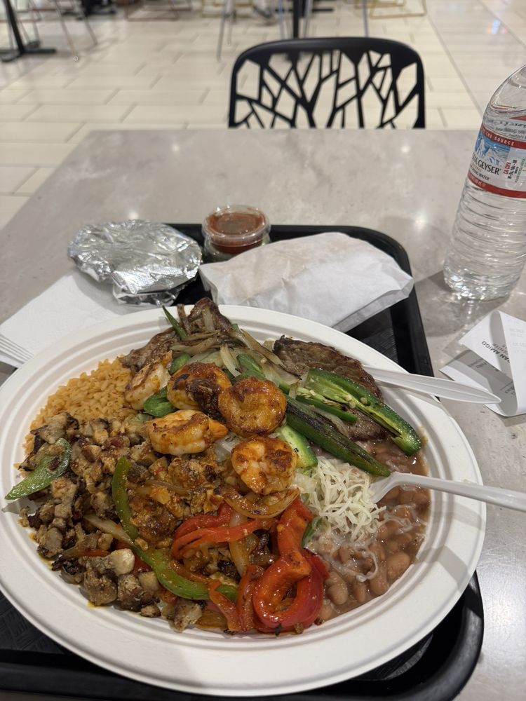 Shrimp, rice, beans, lettuce, pico de gallo (mild), sour cream, cheese, guacamole, tortillas.