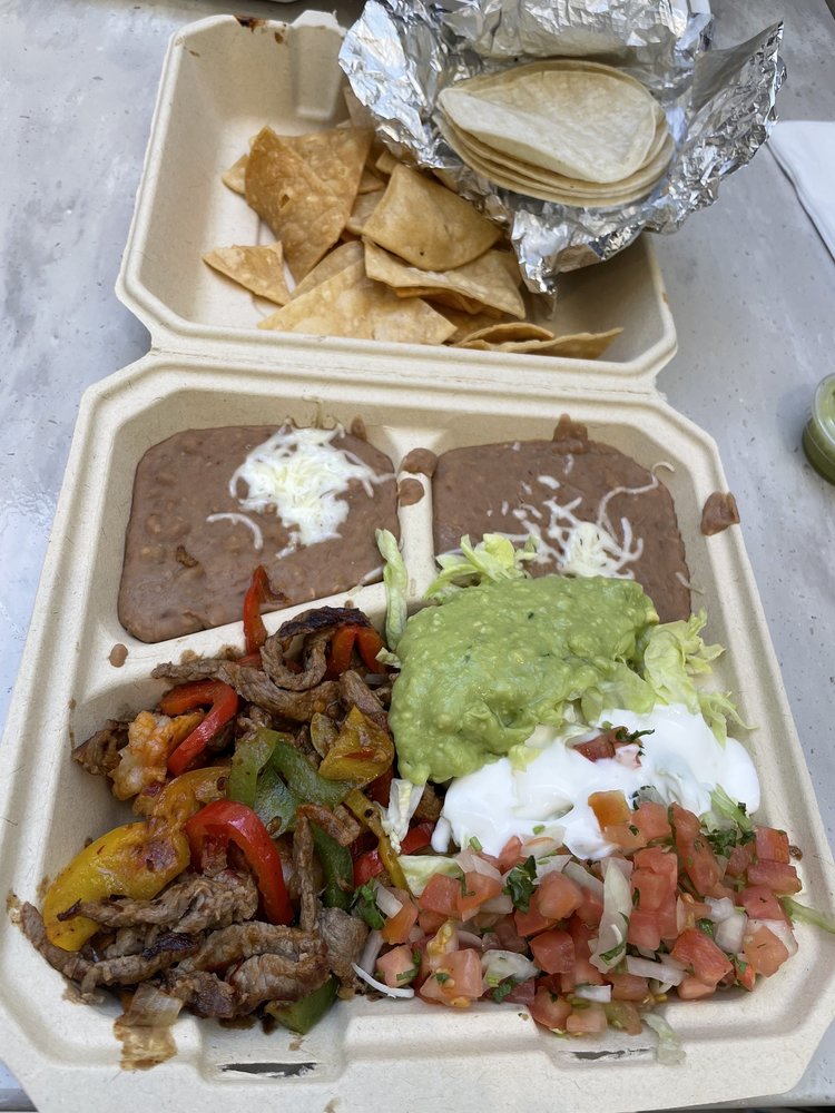 Meat with fajitas mix, rice, beans, lettuce, pico de gallo (mild), sour cream, cheese, guacamole, tortillas.