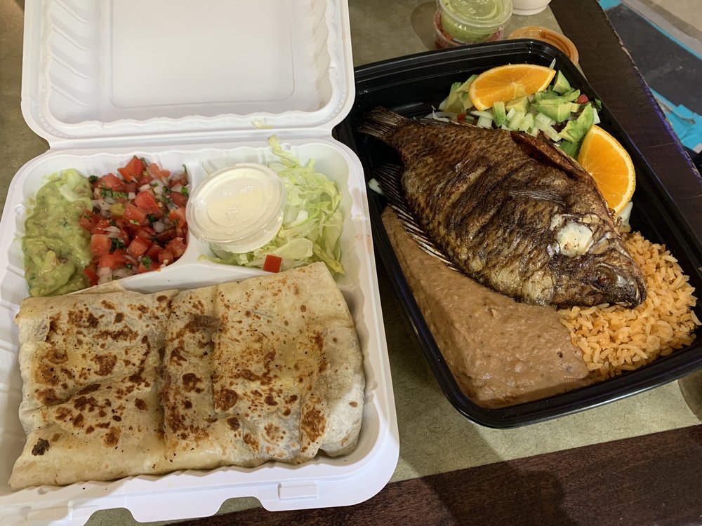 Deep fried Mojarra (tilapia), rice, beans, salad.
